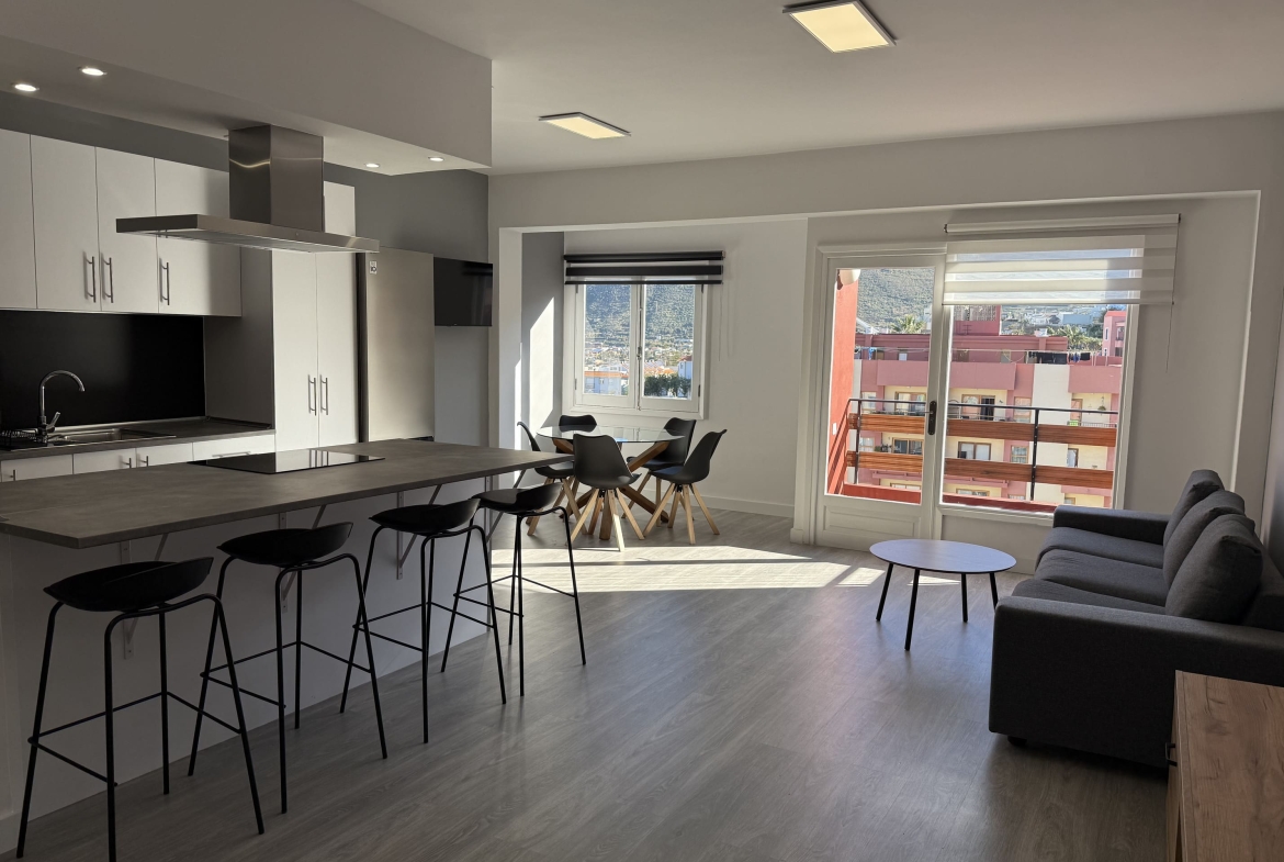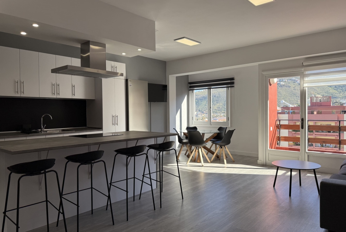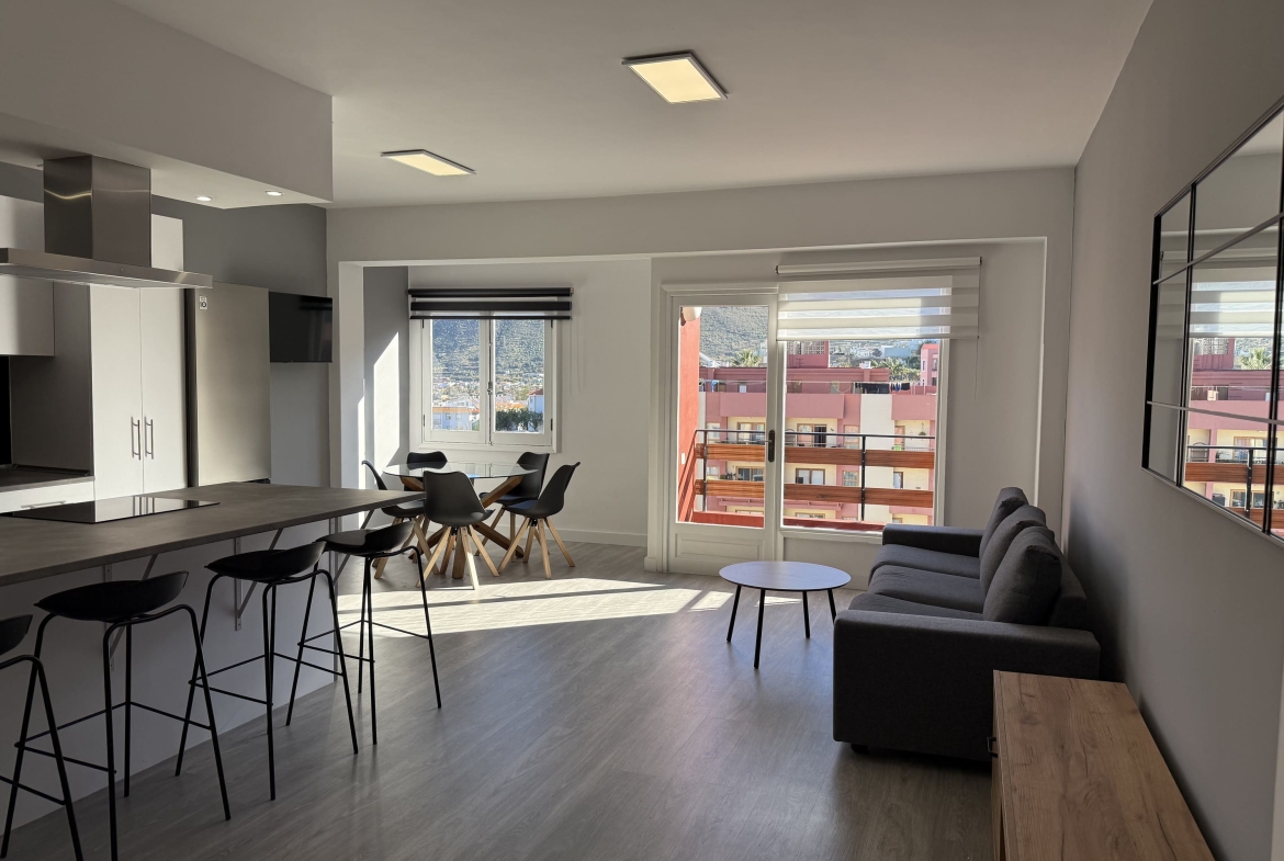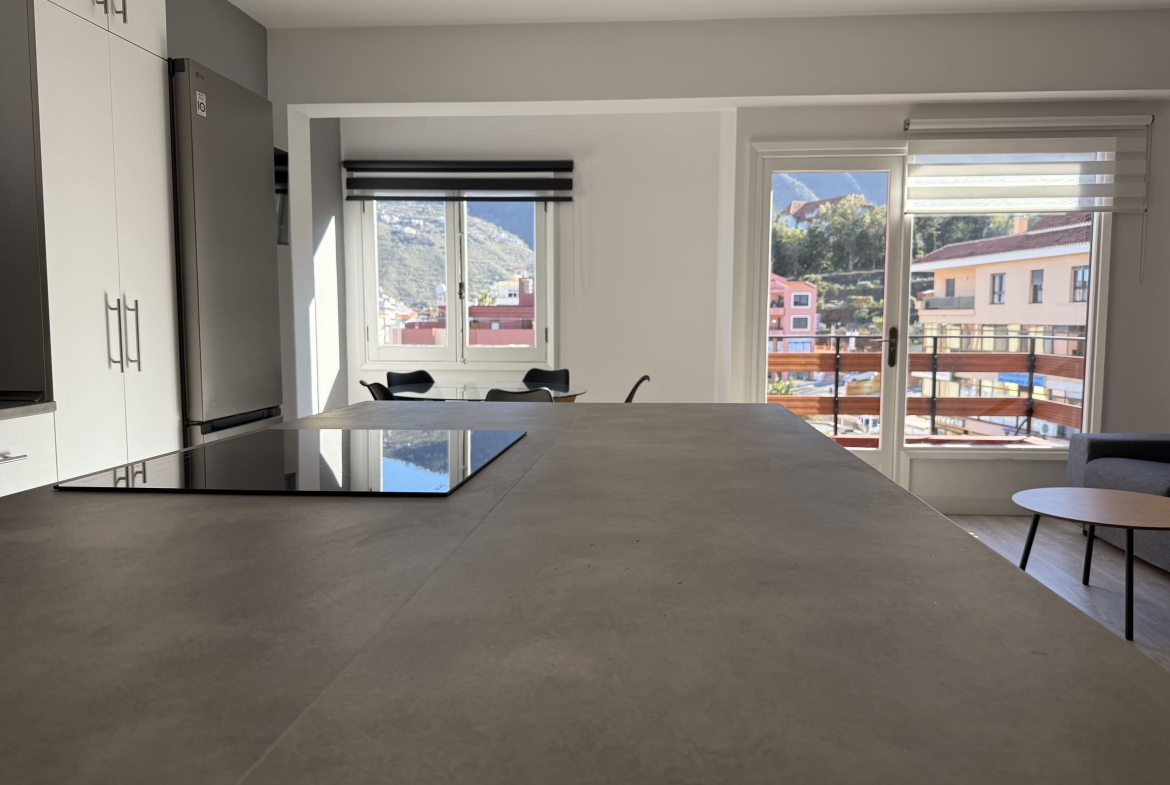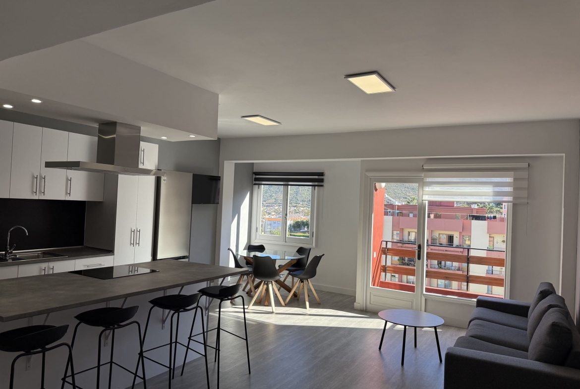 La vivienda dispone de una amplia cocina americana integrada en un espacioso salón-comedor. Además, cuenta con una terraza con vistas panorámicas de 180° al mar y al Teide, ofreciendo un entorno único que combina naturaleza y paisaje urbano.